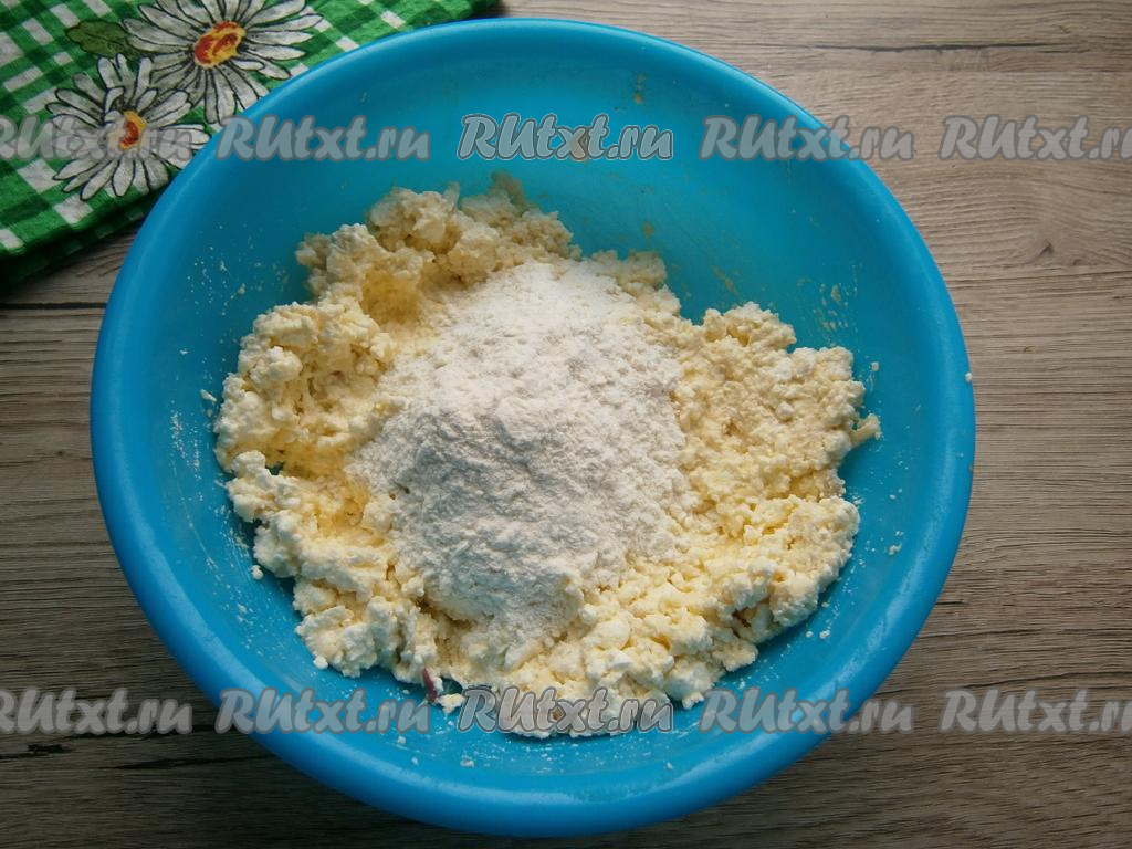 Добавить в творожную массу 2 столовые ложки муки, перемешать. Масса должна получиться густой и липкой, но при этом держащей форму. Много муки не добавляйте, сырники этого не любят.