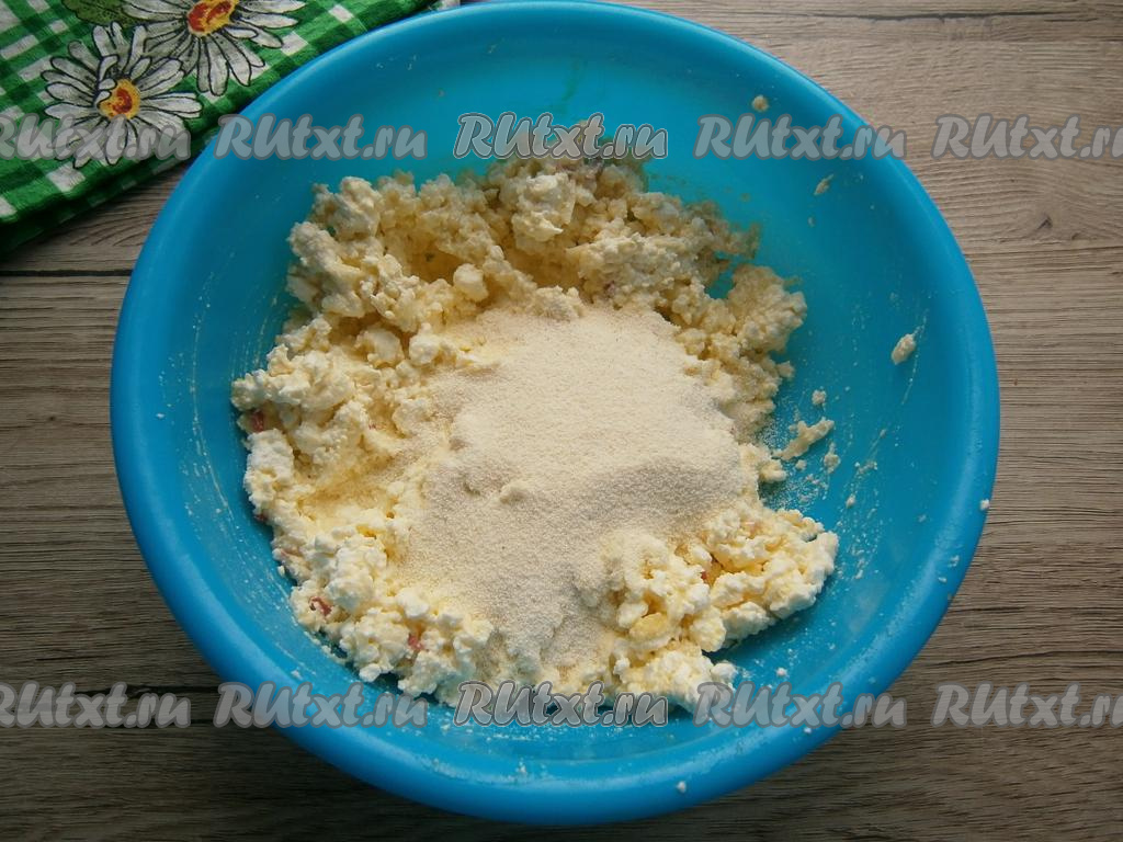 Снова перемешать и всыпать манную крупу. Еще раз массу перемешать, оставить минут на 15-20.