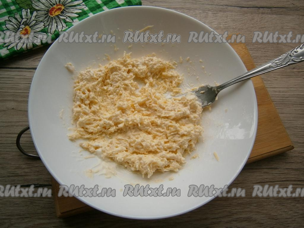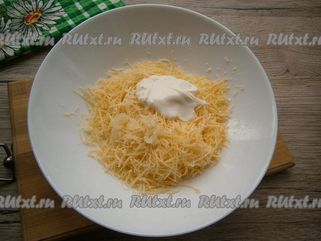 К сыру, натертому на мелкой или средней терке, добавить пропущенный через пресс чеснок и сметану, немного посолить. По желанию, вместо сметаны используйте майонез.