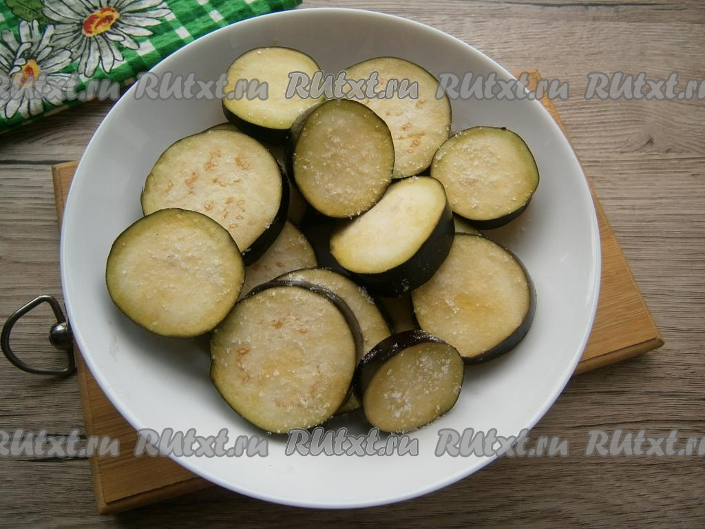 Нарезать баклажаны кружочками толщиной около 1 см, посолить и оставить минут на 30.