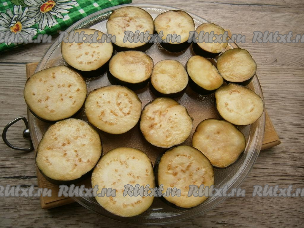 Поставить тарелку с баклажанами в микроволновку и готовить 5 минут при мощности 750 Ватт, после чего остудить. Или же баклажаны можно обжарить до легкой румяности на растительном масле с двух сторон на среднем огне.