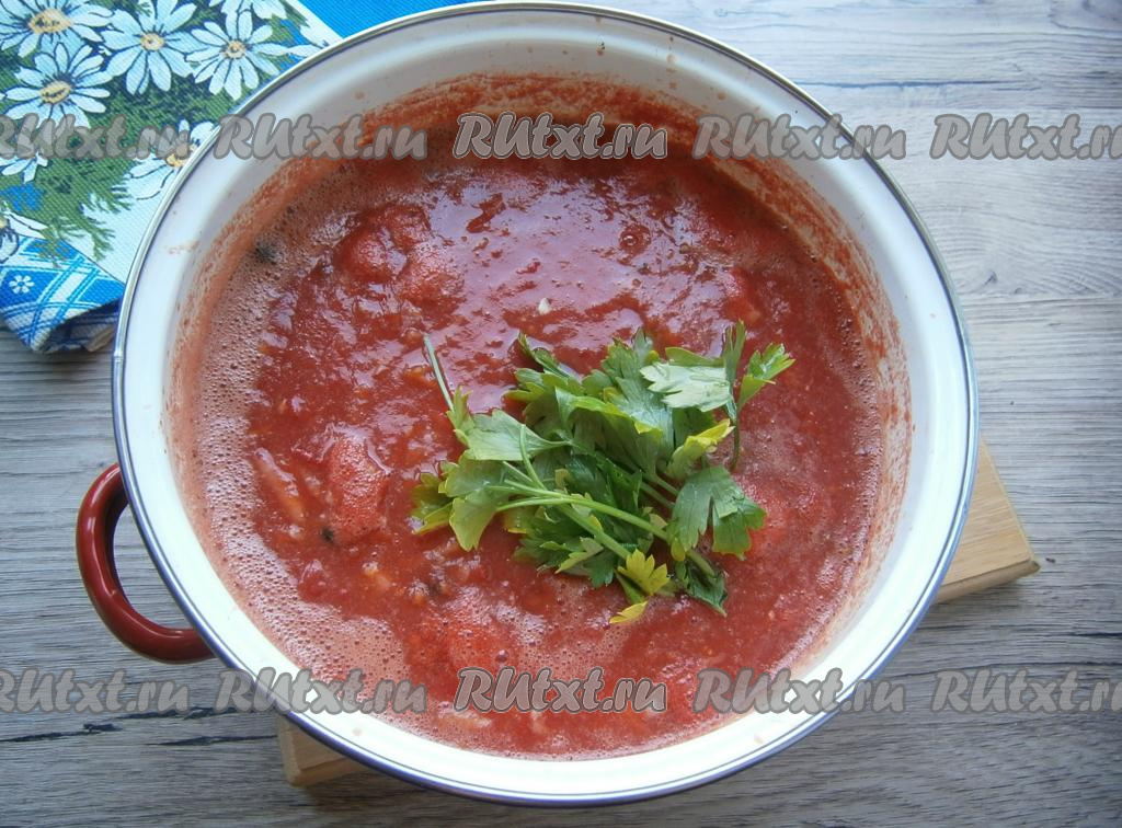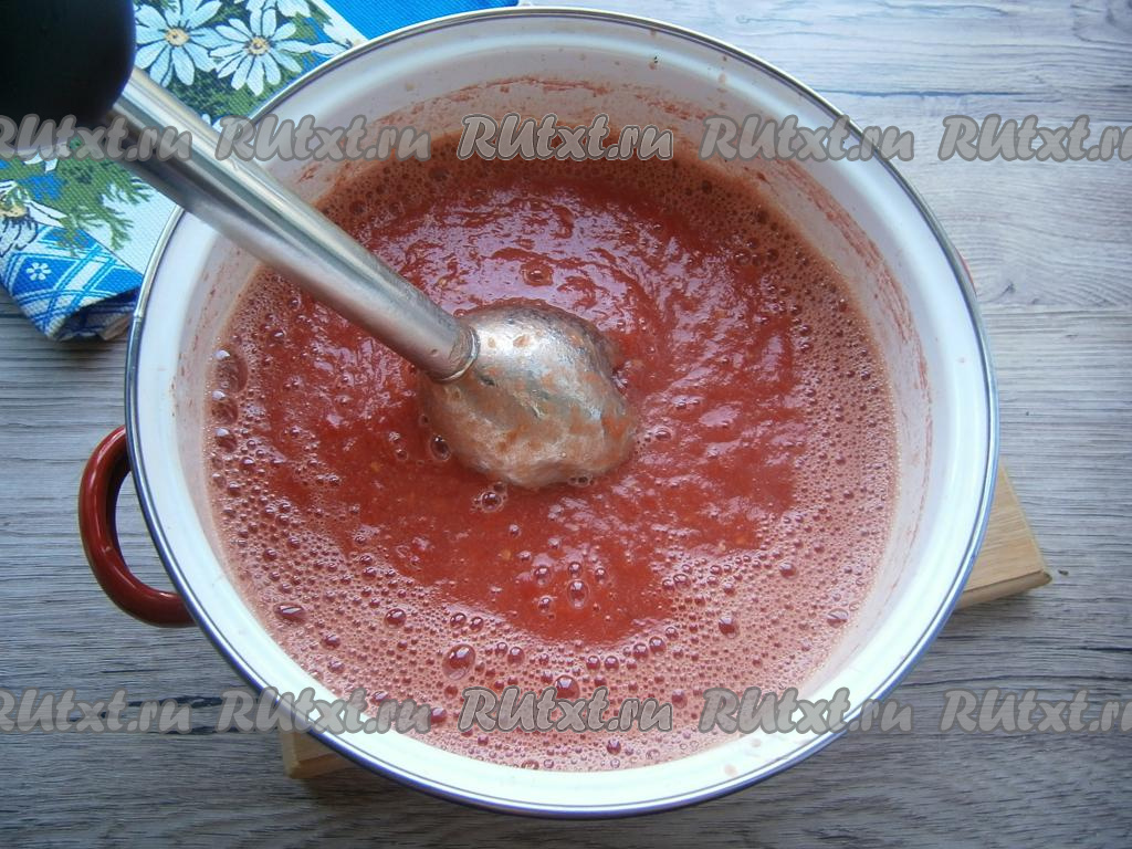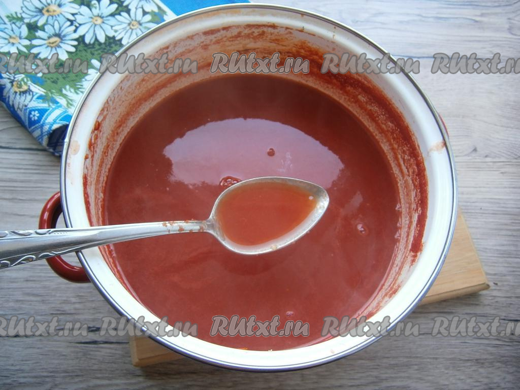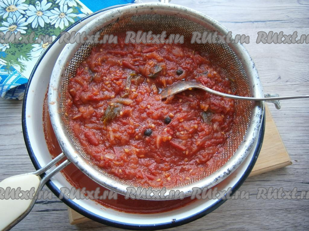 Поставить кастрюлю с томатом на огонь, довести до кипения. Далее варить на небольшом огне, периодически помешивая, 20-30 минут. Затем томат протереть через мелкое сито.