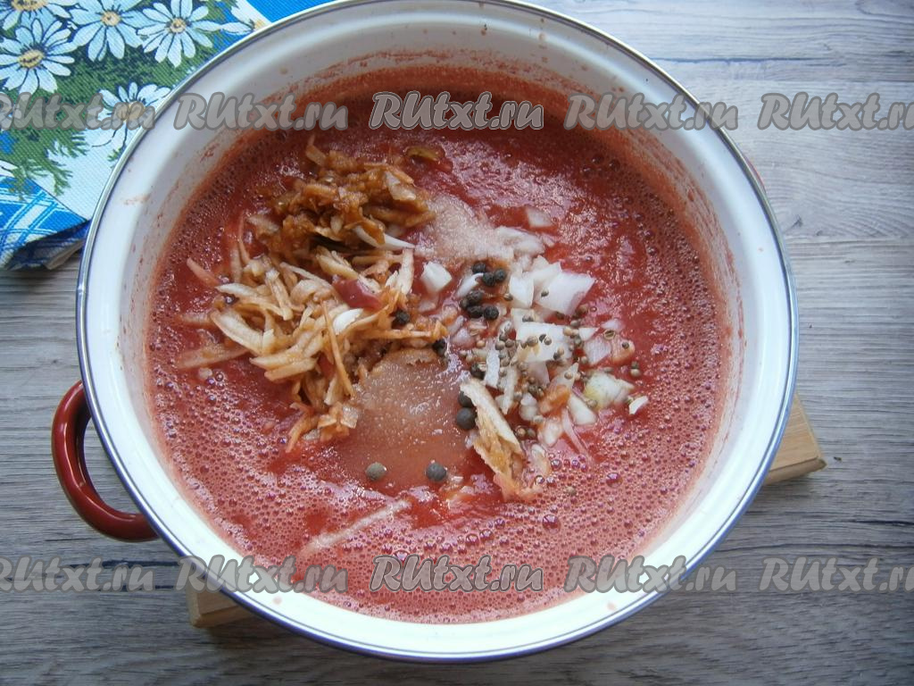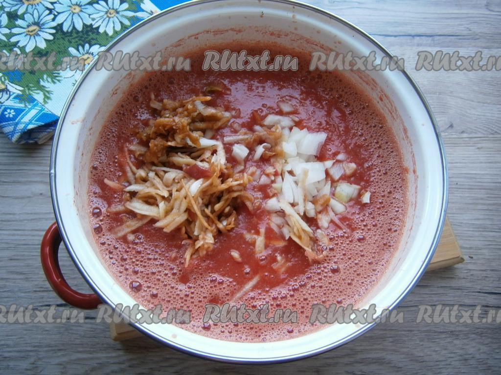 Лук очистить, из яблок удалить сердцевину (кожицу можно оставить). Добавить мелко нарезанный лук и натертые на крупной терке яблоки в томатное пюре.