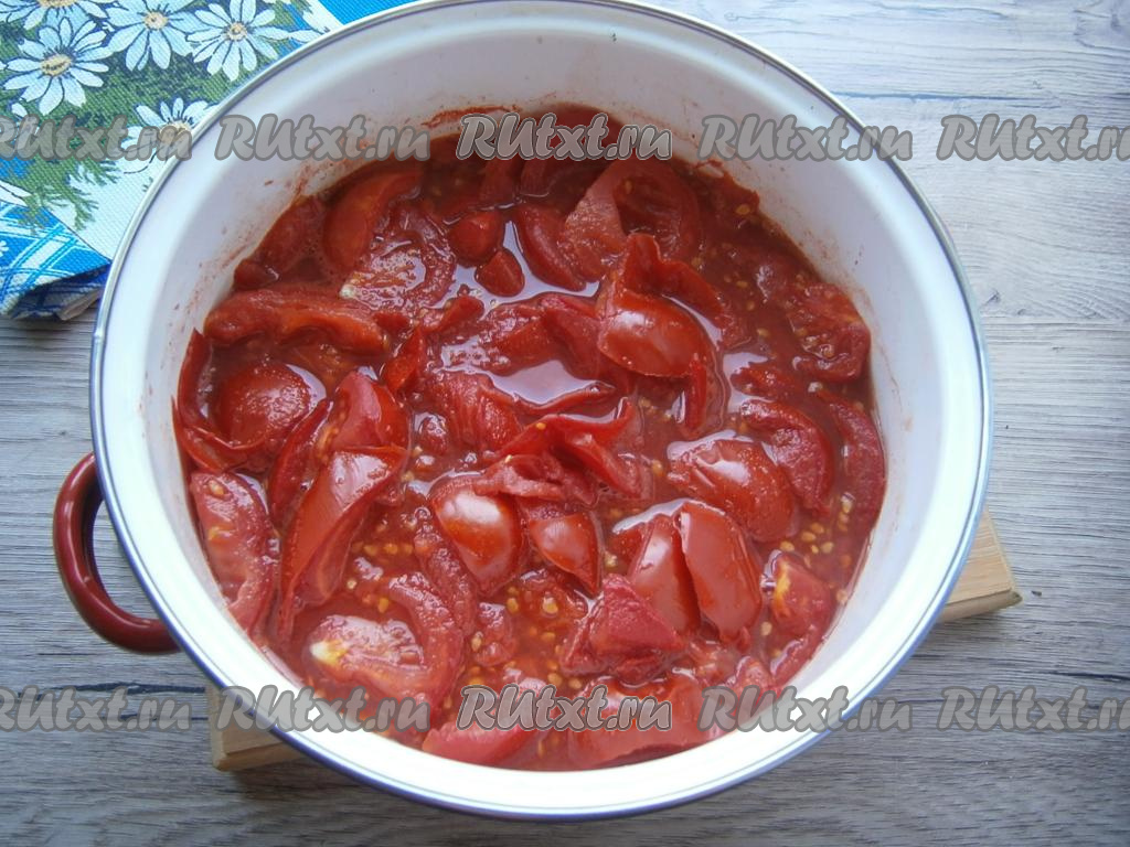 Помидоры (спелые и сочные) нарезать, сложить в кастрюлю и на небольшом огне проварить около 15 минут.