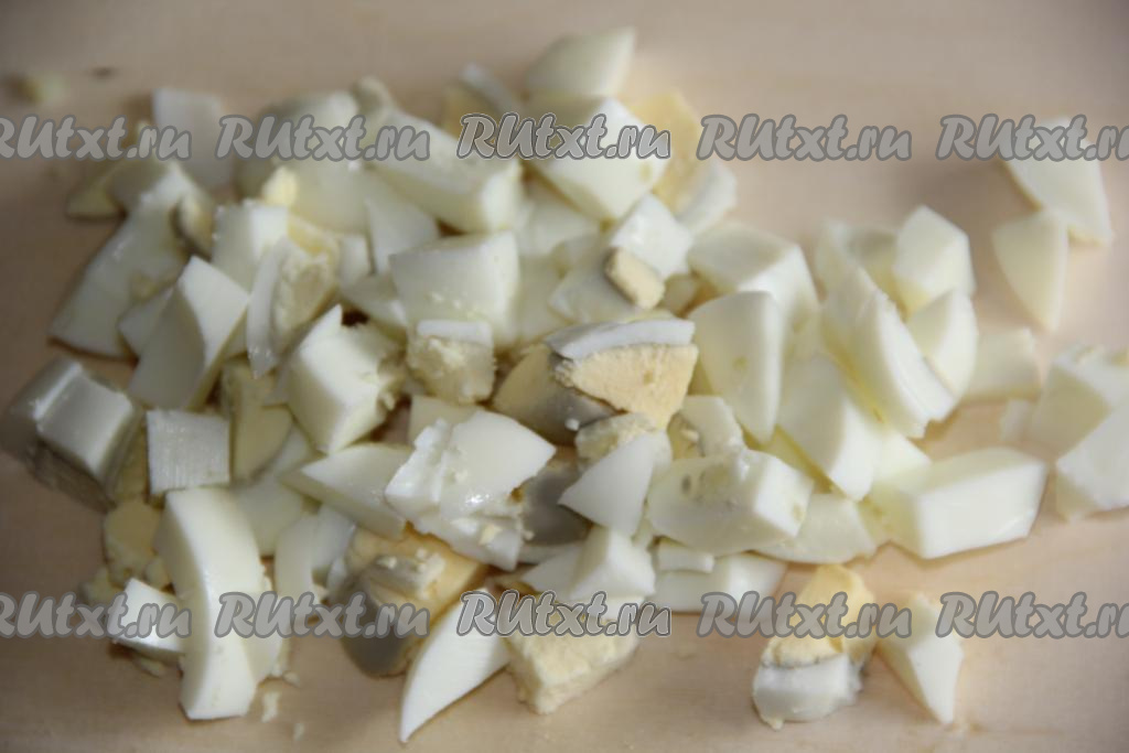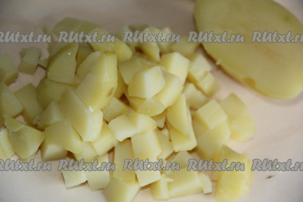Картофель тщательно вымыть, полностью залить водой и отварить в кожуре до готовности (в течение минут 20-25, готовая картошка должна легко прокалываться вилкой или ножом). Яйца залить водой и сварить вкрутую (в течение 10 минут с момента закипания). Затем картошку и яйца остудить и очистить.