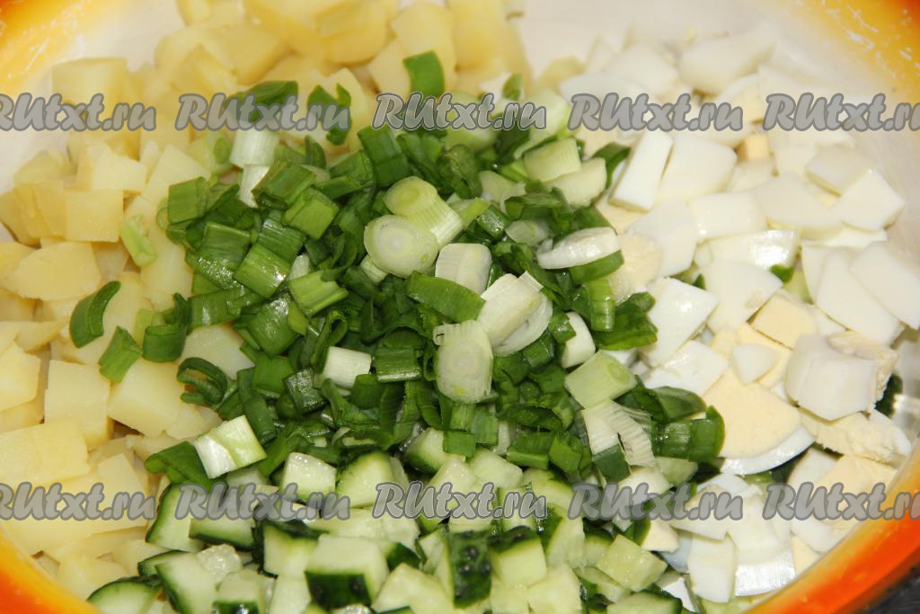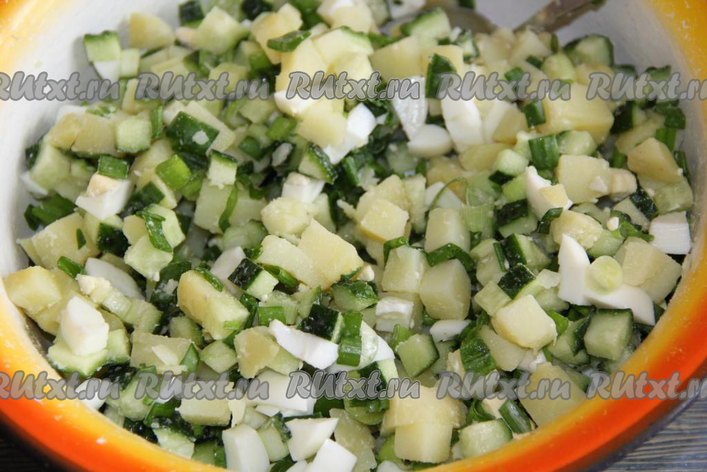В глубокой миске соединить картофель, зелёный лук, огурцы и яйца, добавить соль, можно добавить чёрный молотый перчик.