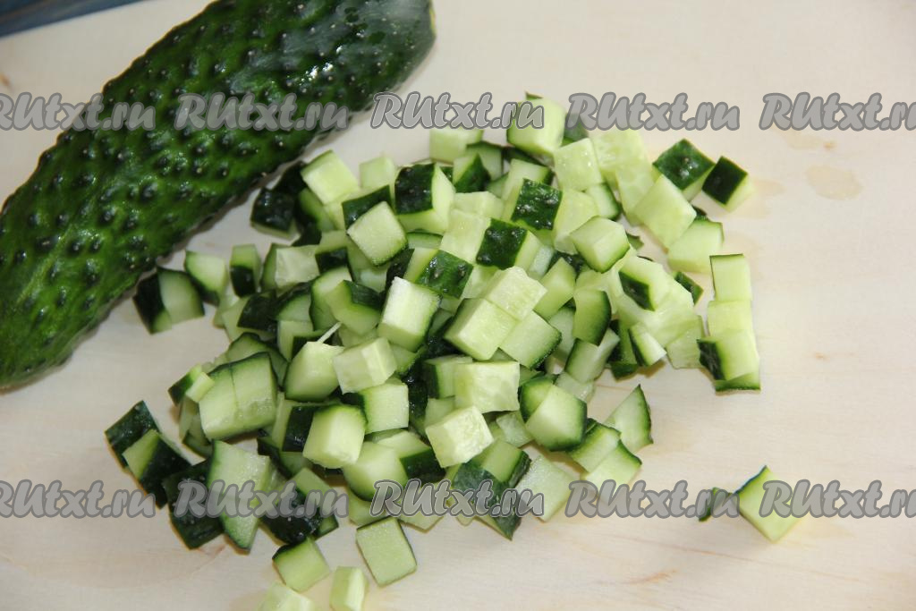 Огурчики вымыть и нарезать. Лучше если картошка, яйца и огурцы будут нарезаны на кубики одинакового размера.