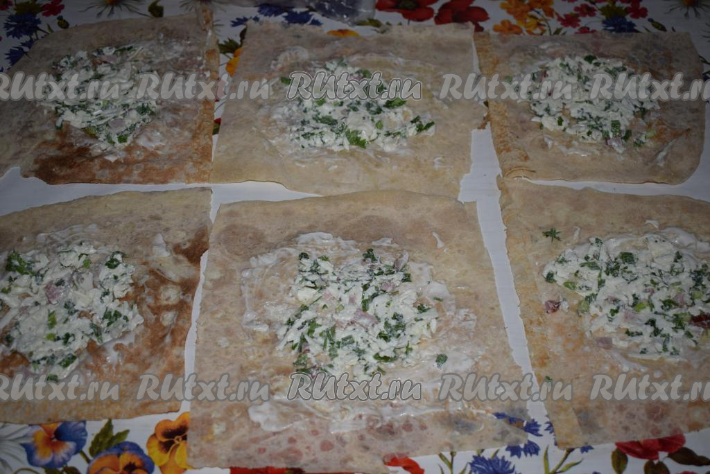 Кладем начинку на квадратики лаваша, смазанные майонезом, разделив начинку на 6 равных частей (по количеству квадратиков лаваша).