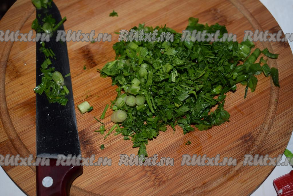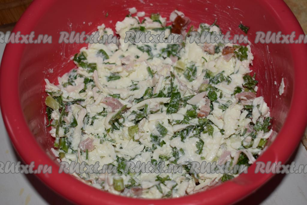 В глубокой миске соединим зелень, сыр, грудинку и хорошо перемешаем начинку для лаваша.