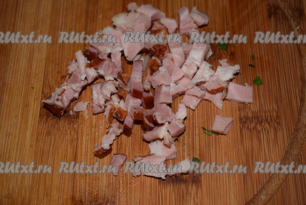 Грудинку нарежем кубиками или тоненькими полосками. Эту закуску можно приготовить и без грудинки, но именно она дает копченый аромат, который делает блюдо особенно аппетитным.