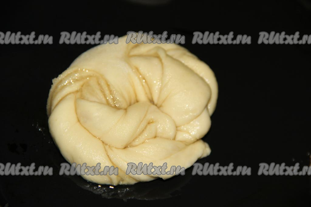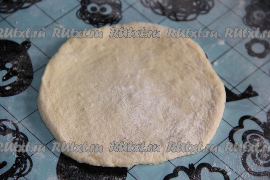 Готовое тесто обмять и дать подняться ещё раз. Затем обмять тесто и разделить его на небольшие части. Каждую часть теста на столе, присыпанном мукой, раскатать в круг (не очень тонко). У меня получилось 10 плюшек.