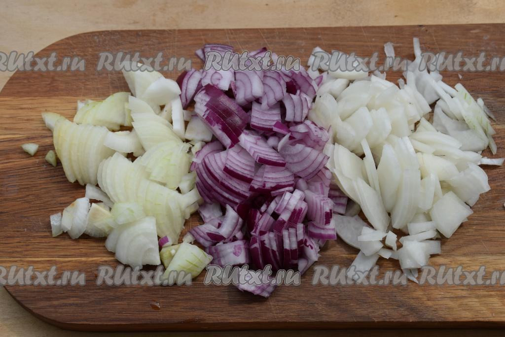 Пока тесто подходит, готовим начинку. Для этого очищаем лук и нарезаем его тонкими полукольцами или четверть кольцами. У меня в начинке 3 сорта лука - белый, репчатый и фиолетовый, но вы можете использовать какой-нибудь один сорт - от этого вкусовые свойства начинки не изменятся.