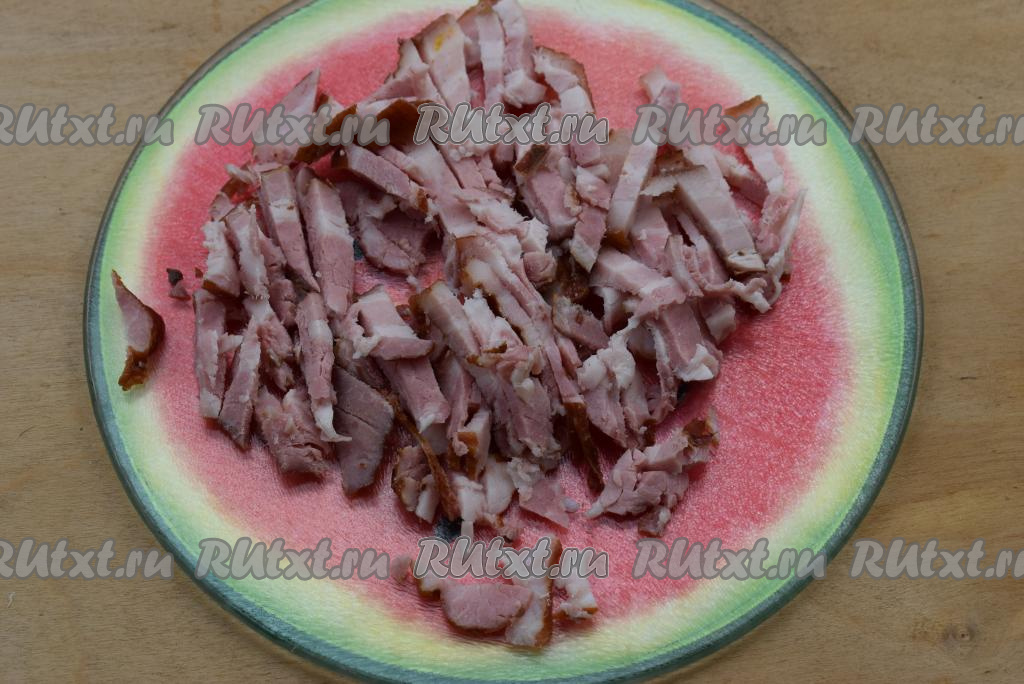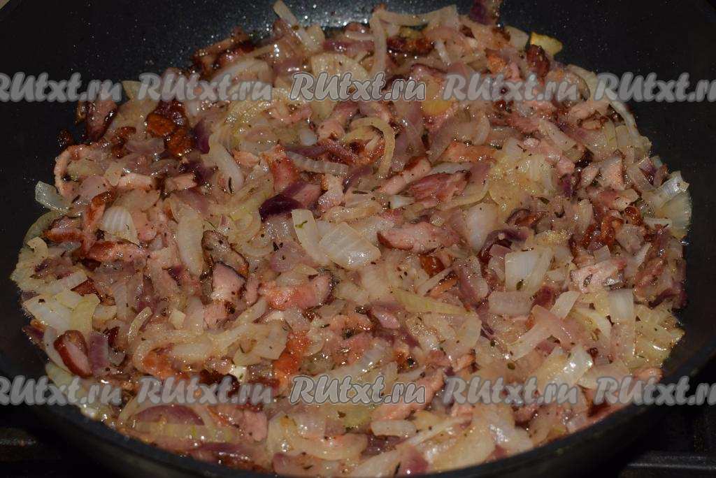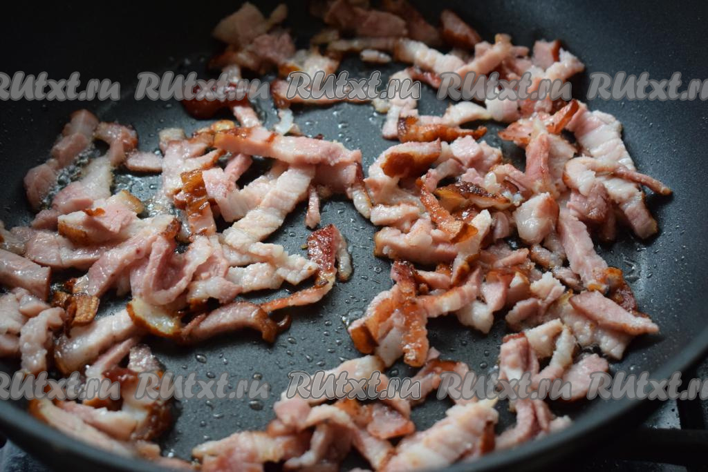 Разогреваем сковороду и наливаем в нее немного растительного масла. Добавляем нарезанный бекон и обжариваем его на среднем огне, помешивая, до золотистого цвета.