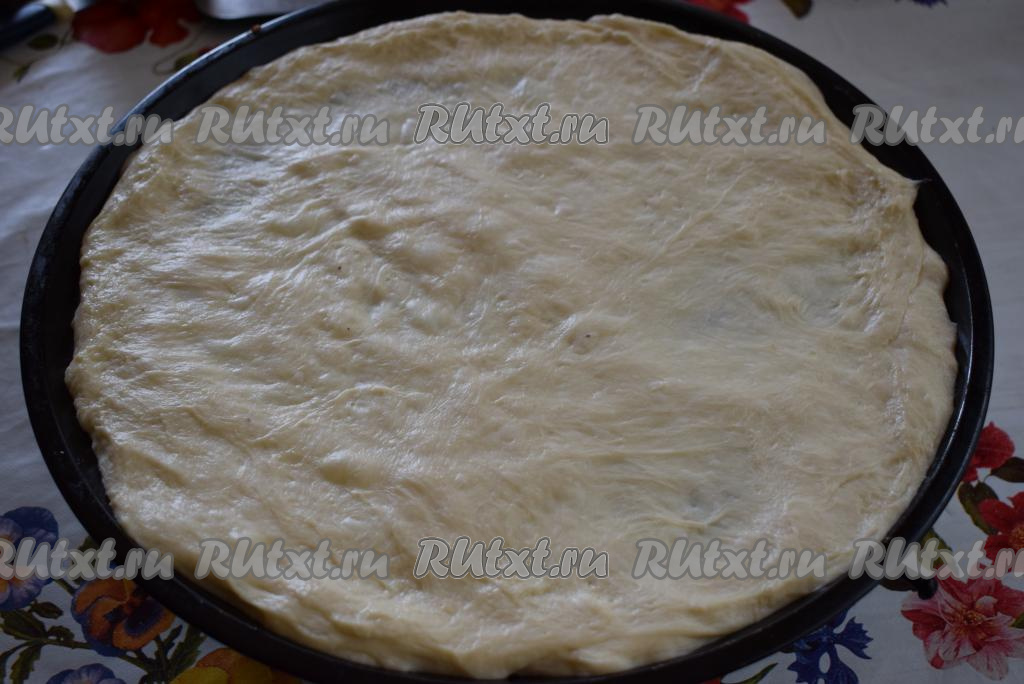 Готовое дрожжевое тесто слегка вымешиваем. Начинаем формировать луковый пирог, для этого форму для выпечки смазываем растительным маслом и выкладываем тесто на дно формы. Распределяем тесто руками по размеру формы (у меня форма диаметром 34 см).