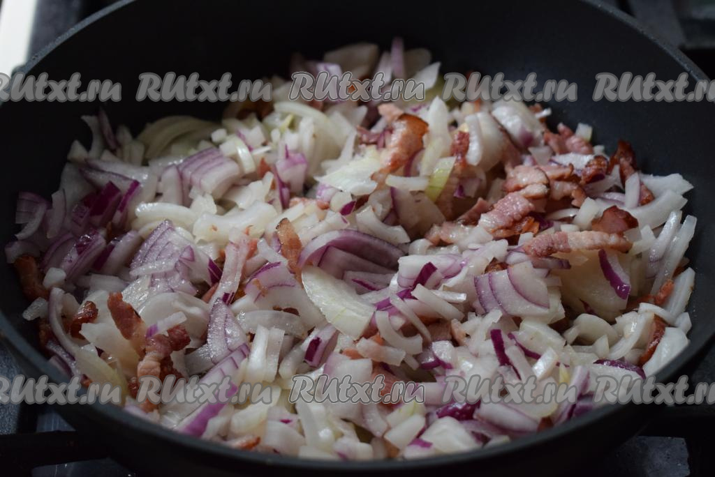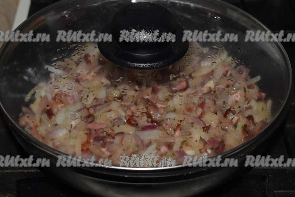 Томим лук с беконом на медленном огне, примерно, 20-25 минут (до размягчения лука), иногда помешивая луковую начинку для пирога.