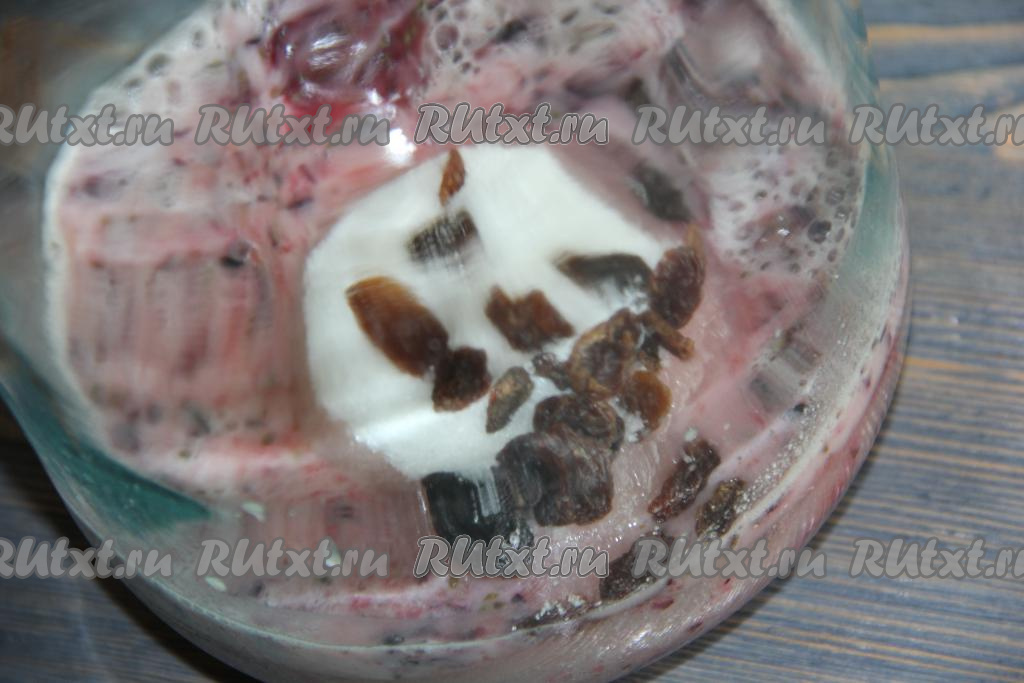 Всыпать в банку сахар и добавить изюм.