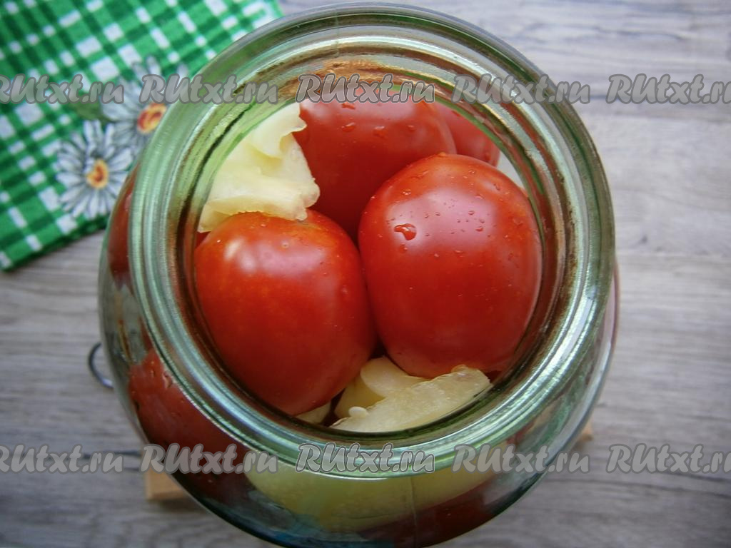 Из болгарского перца удалить семенную коробку. Заполнить банки плотными, не поврежденными свежими помидорами, между которыми разместить половинки или четвертинки сладкого болгарского перца.
