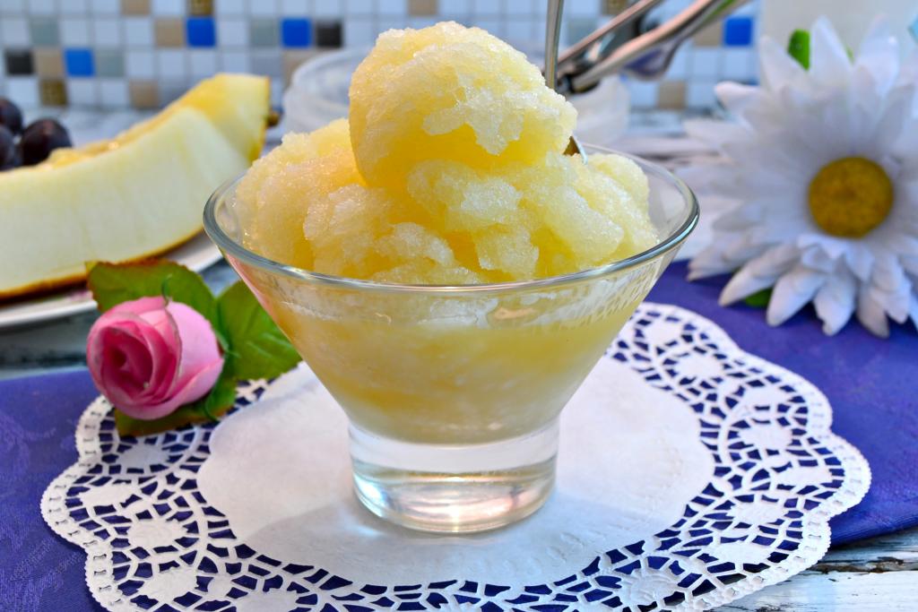 Замерзший, необычайно ароматный и вкусный сорбет, приготовленный из дыни, разложить по хорошо охлажденным креманкам и сразу же подать к столу.