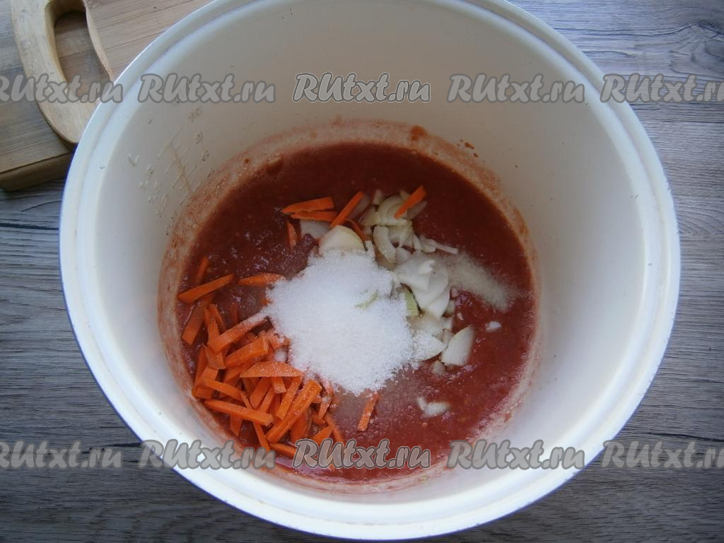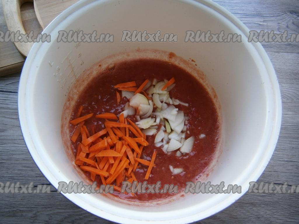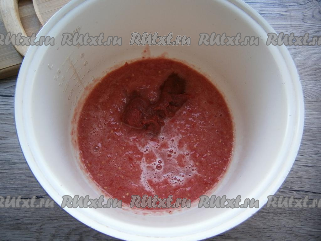 Помидоры перекрутить на мясорубке, получившийся томат вылить в чашу мультиварки, добавить томатную пасту, перемешать до однородности.