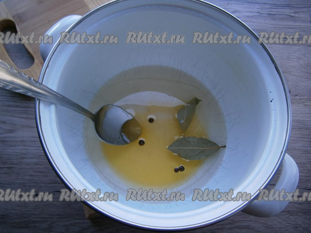 В кастрюлю влить воду, добавить соль, мед, лавровые листья и горошины душистого перца, маринад перемешать, поставить на огонь и довести до кипения.