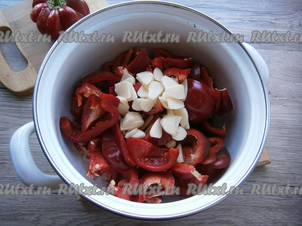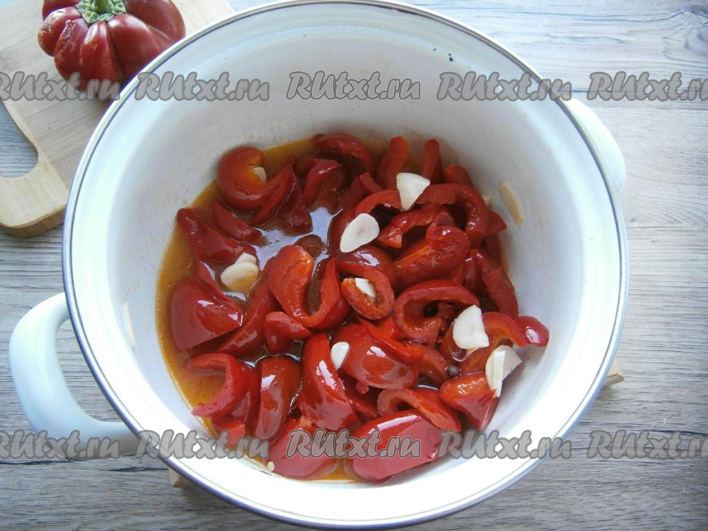 Когда маринад с перцем закипит, варить 10 минут на небольшом огне, периодически перемешивая. В конце варки влить уксус.
