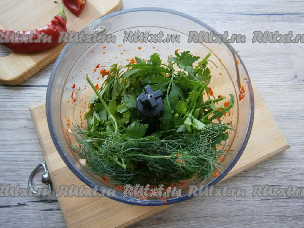 Также добавить в аджику и зелень (зелень можно измельчить блендером или мелко нарезать).