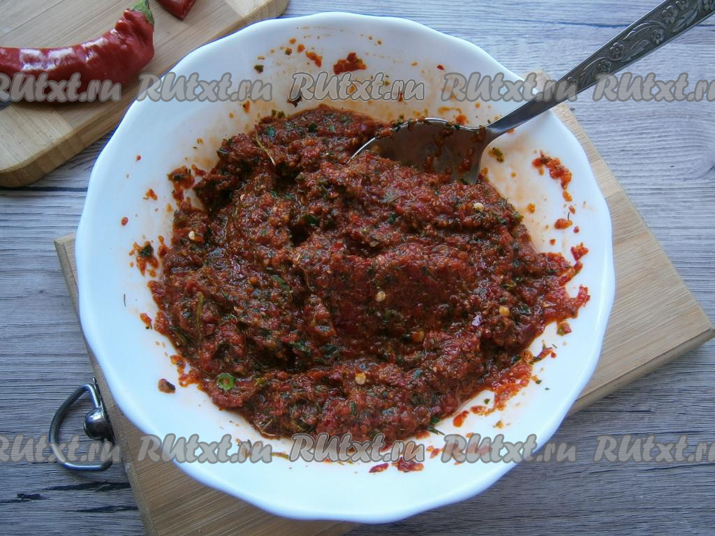Аджику тщательно перемешать. По консистенции она должна быть гладкой, маслянистой и не жидкой.