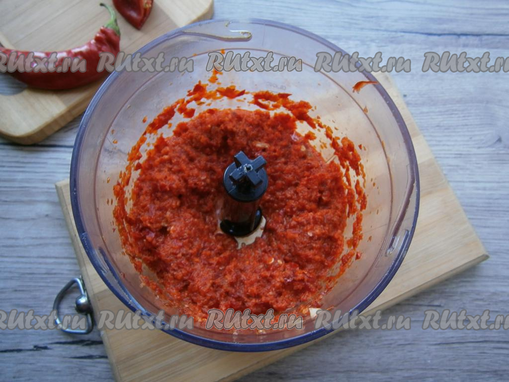 Перец и чеснок измельчить в чаше блендера или перекрутить на мясорубке.