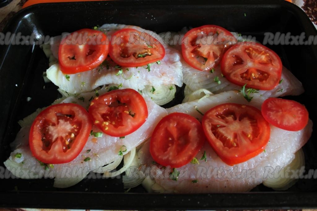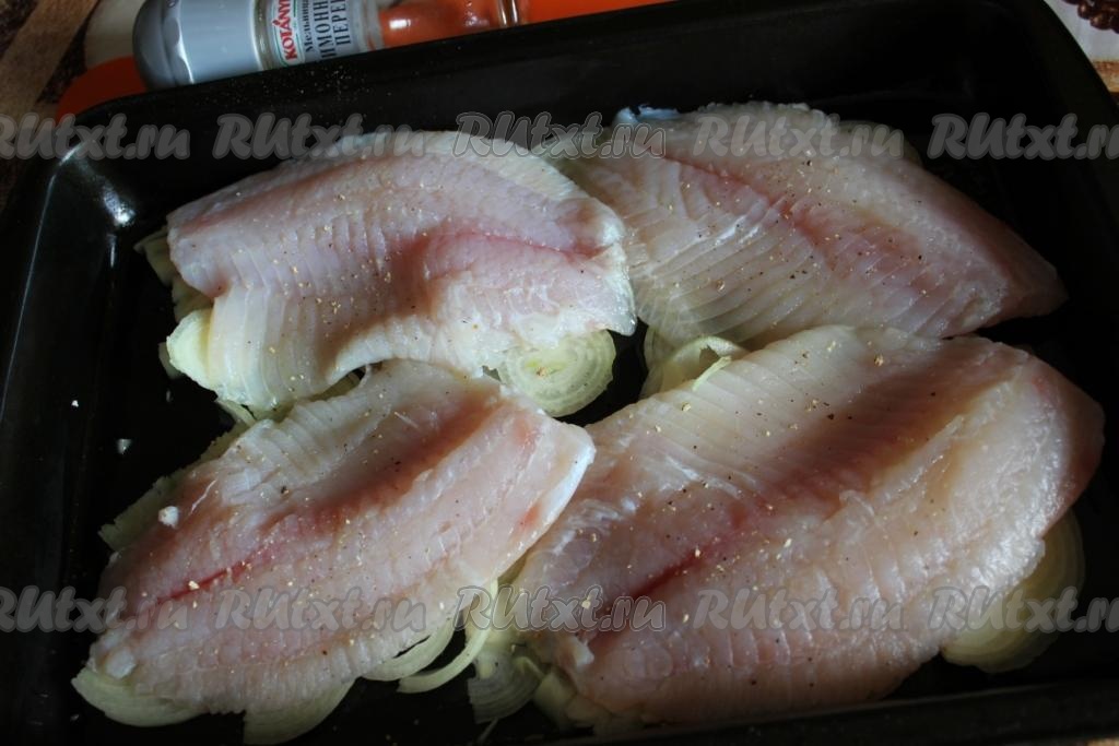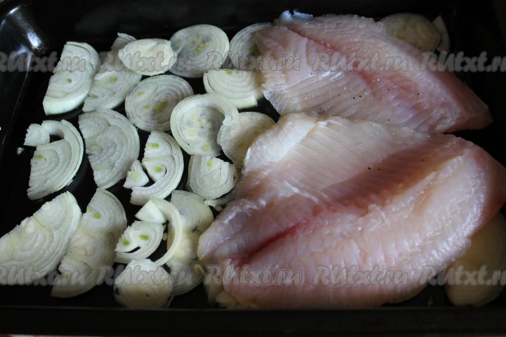 На смазанный растительным маслом противень положите слой нашинкованного лука и на него уложите филе тилапии.