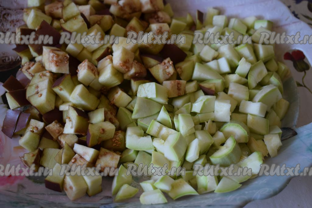 Далее нарежем на кубики кабачки и баклажаны.