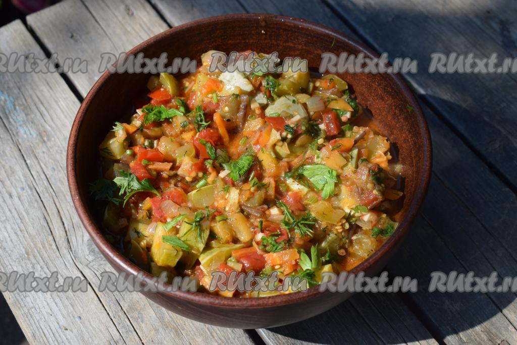 Перекладываем наши сочные и очень вкусные овощи, тушеные с кабачками и баклажанами, из сковороды в глубокую тарелку, охлаждаем до теплого состояния и подаем к столу.