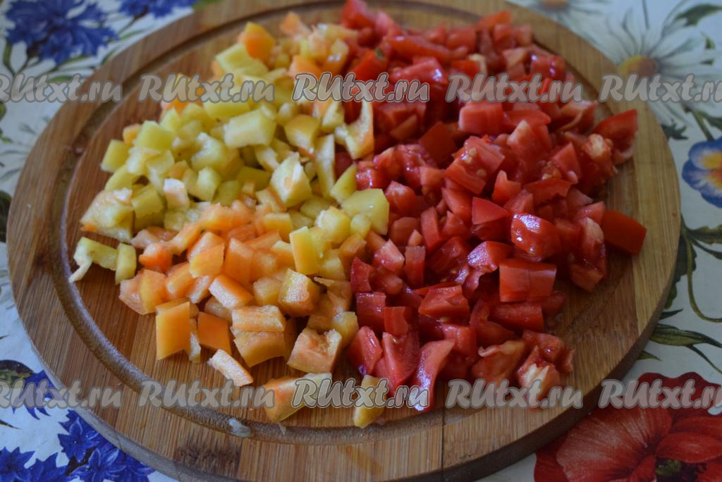 Помидоры и болгарский перец нарежем мелкими кубиками.