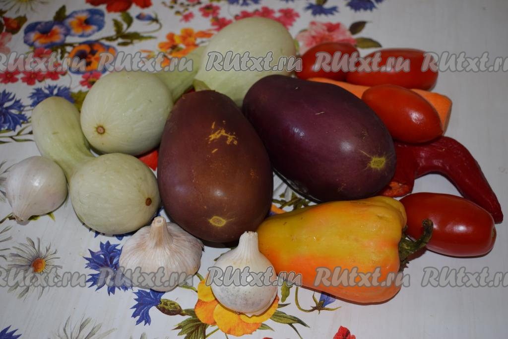 Овощи вымоем. Обрежем плодоножки у баклажанов и кабачков (если кабачки не очень молодые, тогда очистите их от кожуры и удалите семена), удалим семенную коробочку из перца, очистим от кожицы лук, морковь и чеснок, у помидоров обрежем кончики.
