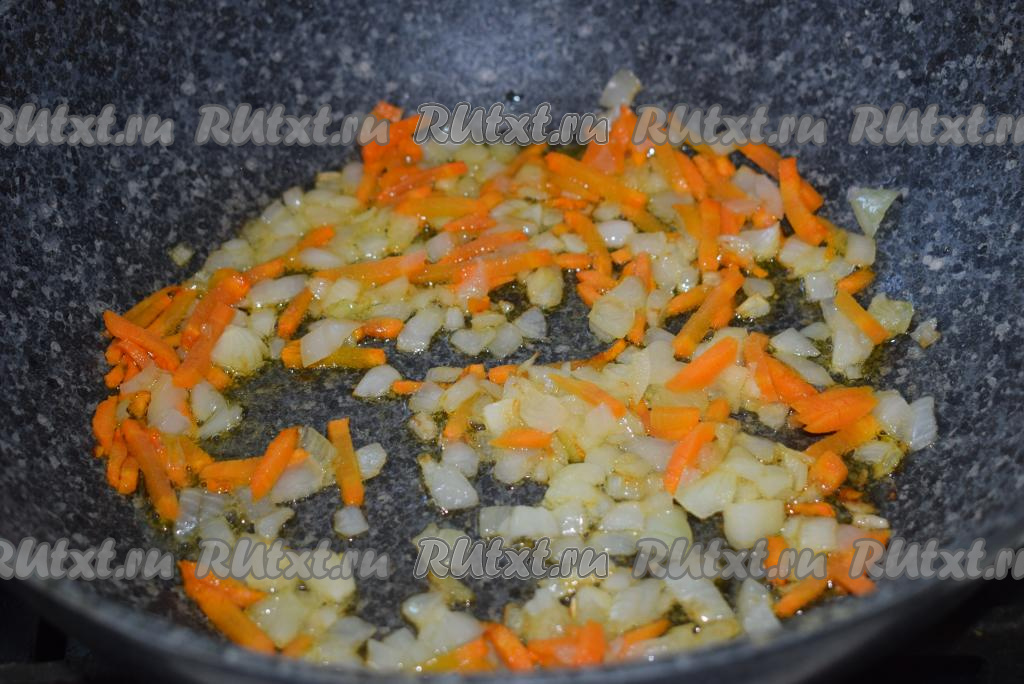 В сковороде разогреем на слабом огне растительное масло, выложим лук и морковь.