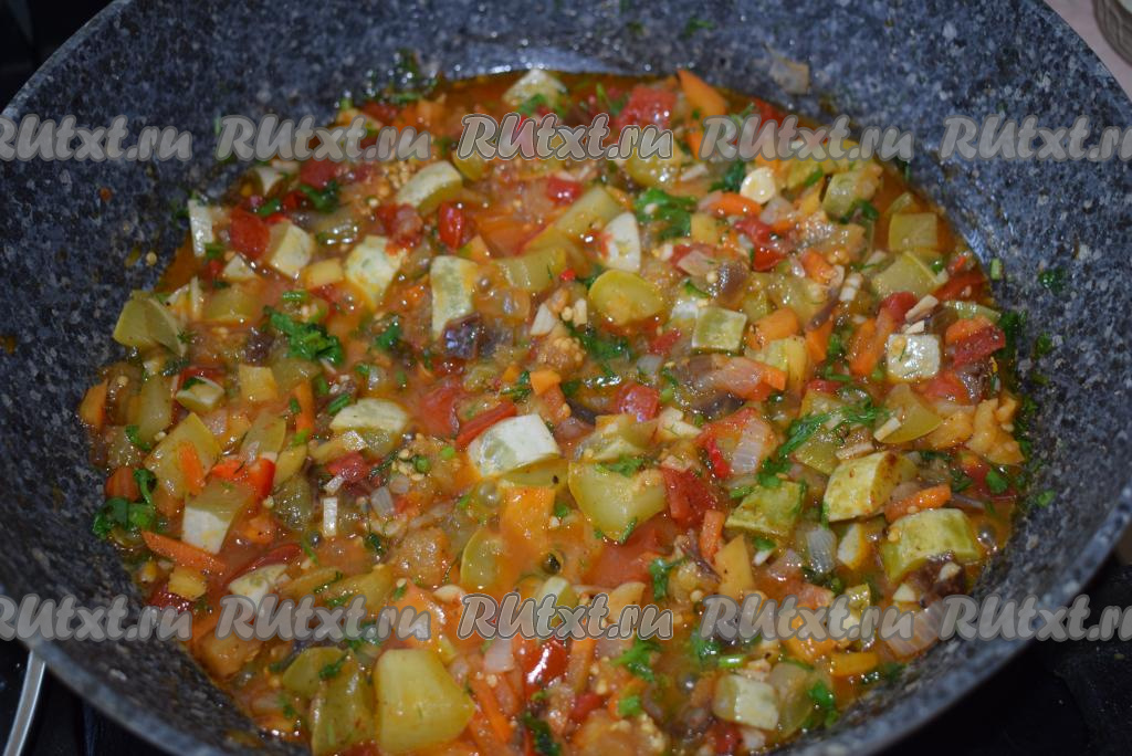 Перемешиваем зелень с чесноком и острым перцем с тушеными овощами и выключаем огонь.