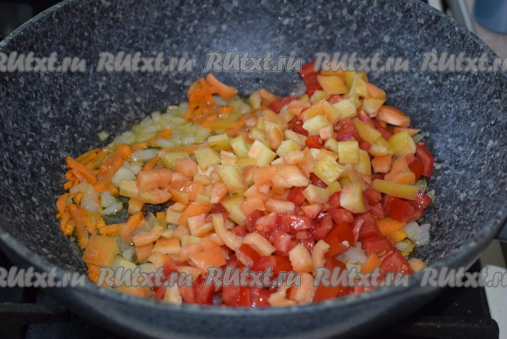 Сразу же накроем сковороду крышкой и будем томить овощи на небольшом огне до прозрачности лука (примерно, 10-12 минут), периодически помешивая. Далее добавим в сковороду болгарский перец и помидоры.