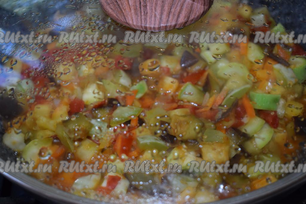Накроем сковороду крышкой и будем тушить наши овощи на слабом огне, примерно, 25-30 минут.