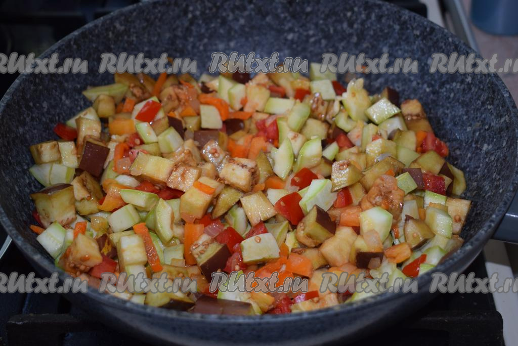 Перемешаем, накроем крышкой и потушим все вместе 7-8 минут, иногда перемешивая. Добавим к овощам баклажаны и кабачки, перемешаем.