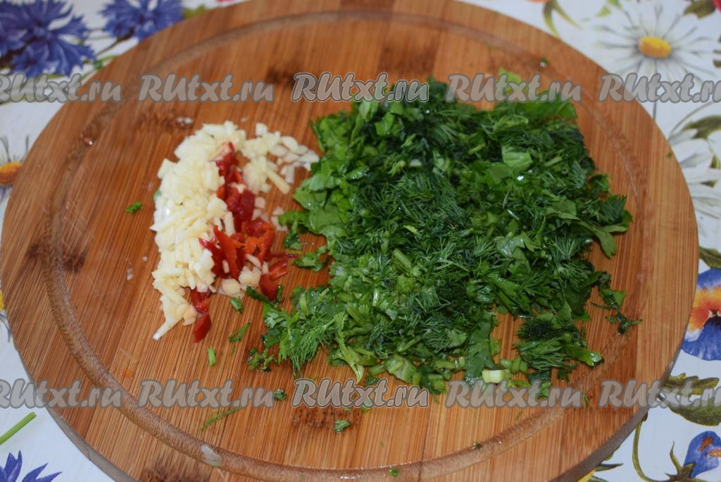 Чеснок и острый перец нарежем мелко, измельчим зелень.