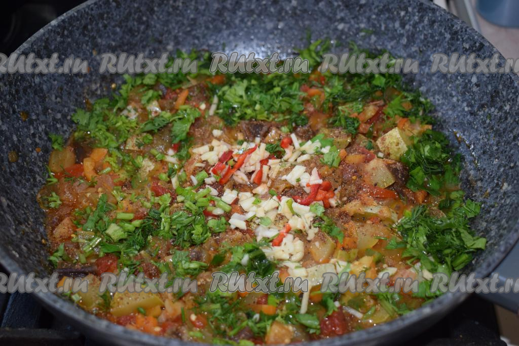 Кладем зелень, чеснок и острый перец. По окончании приготовления наше блюдо будет очень сочным и безумно ароматным!