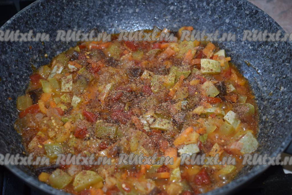 Когда тушеные овощи станут мягкими и практически готовыми (как на фото), добавляем в сковороду специи, соль, молотый черный перец, перемешиваем.