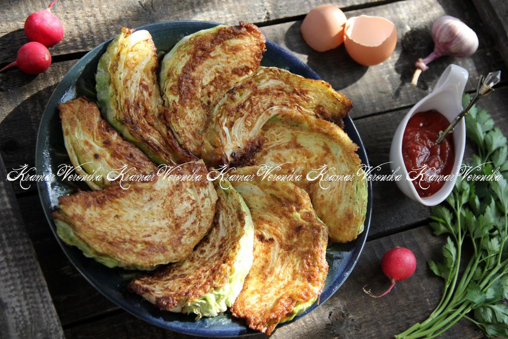 Подать капусту в горячем виде, можно с любым соусом или кетчупом. Куски капусту, благодаря тому что перед обжариванием мы обмакнули их в яйцо, получились очень аппетитными.