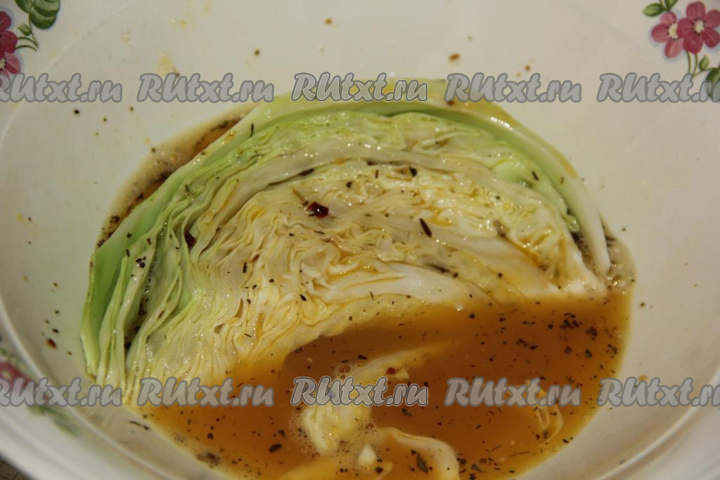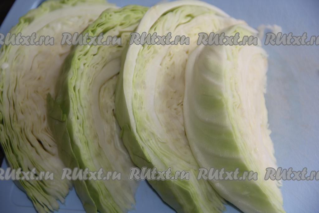 С капусты снять несколько верхних листочков, а затем нарезать на кусочки так, чтобы кочерыжка держала листочки. Я разрезала кочан пополам, а затем каждую половину нарезала ещё на 6 долек.
