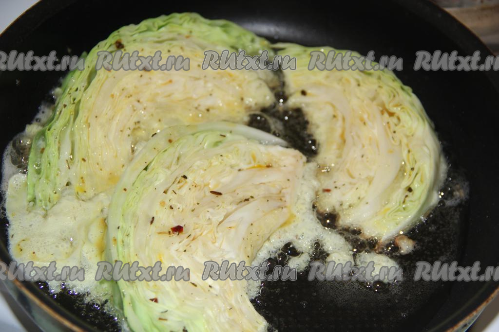 В сковороду влить растительное масло и разогреть. Выложить дольки капусты в сковороду так, чтобы они заполнили все дно.