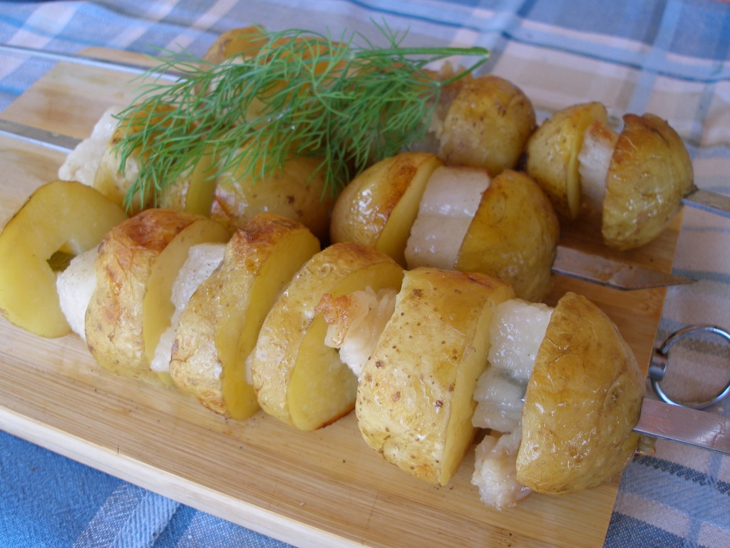 Молодая картошка с салом на шампурах на мангале