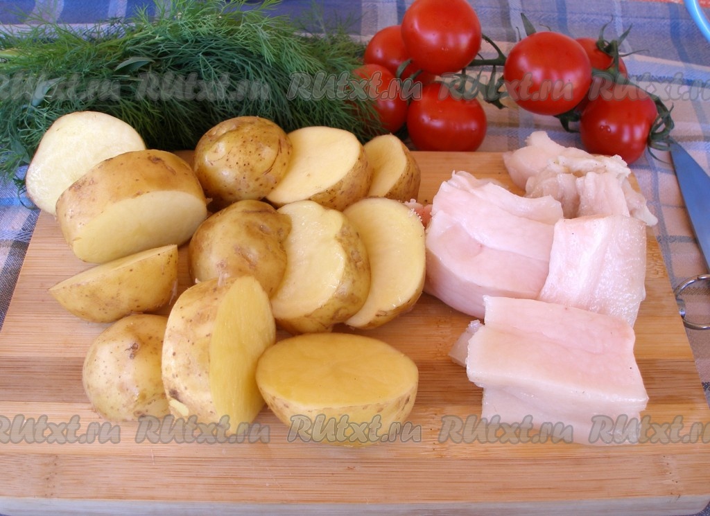 Тщательно вымытый молодой картофель (я не снимала кожуру) нарезать крупными дольками. Сало нарезать кубиками, соразмерно с картофелем.