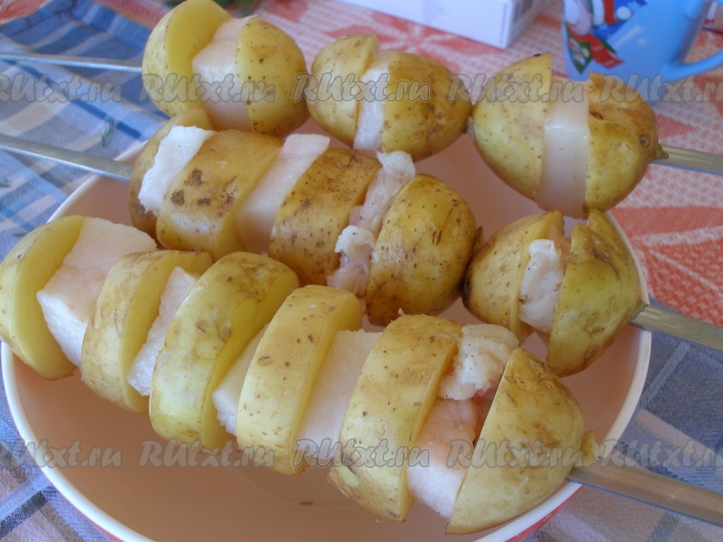 Нарезанную картошку и сало нанизывать на шампуры, чередуя кусочки картофеля с кусочками сала.