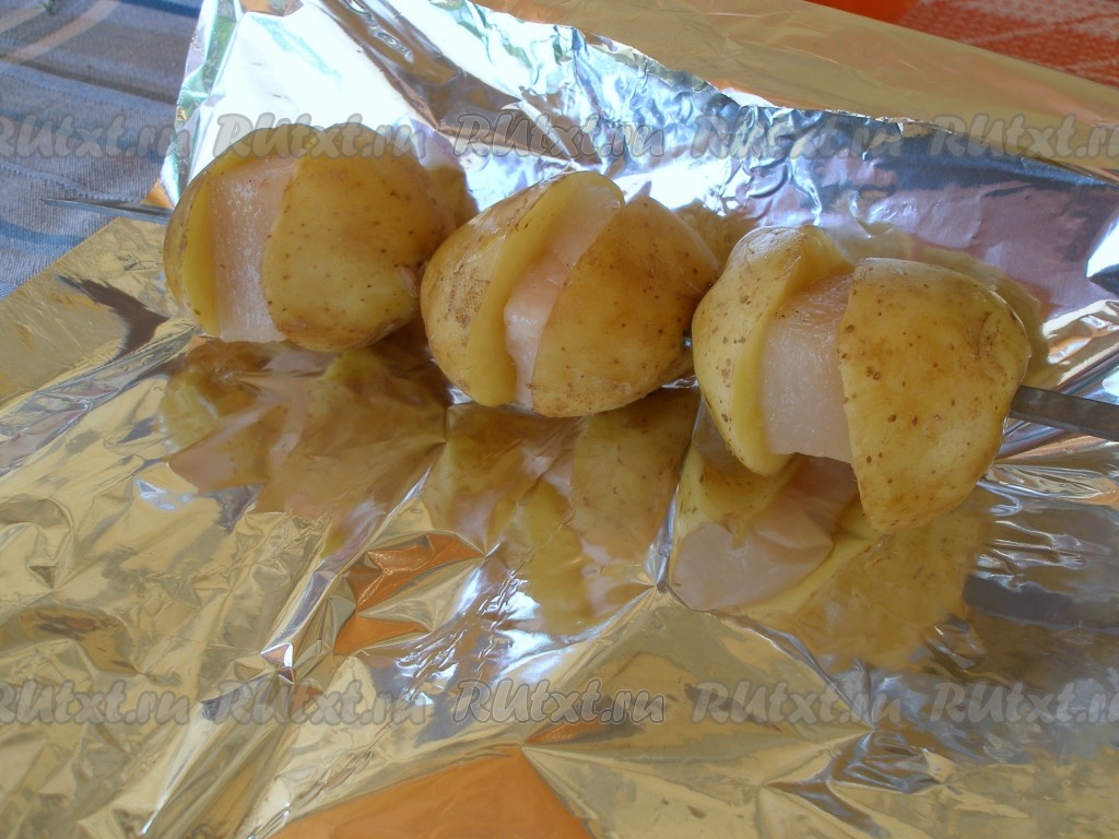 Обернуть картофель с салом на шампуре фольгой.