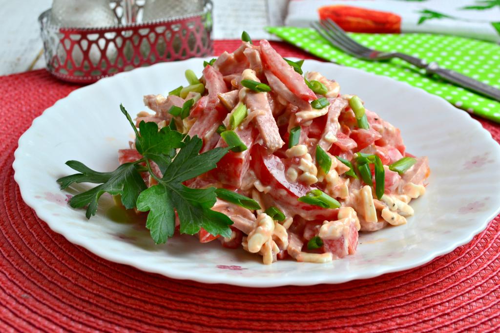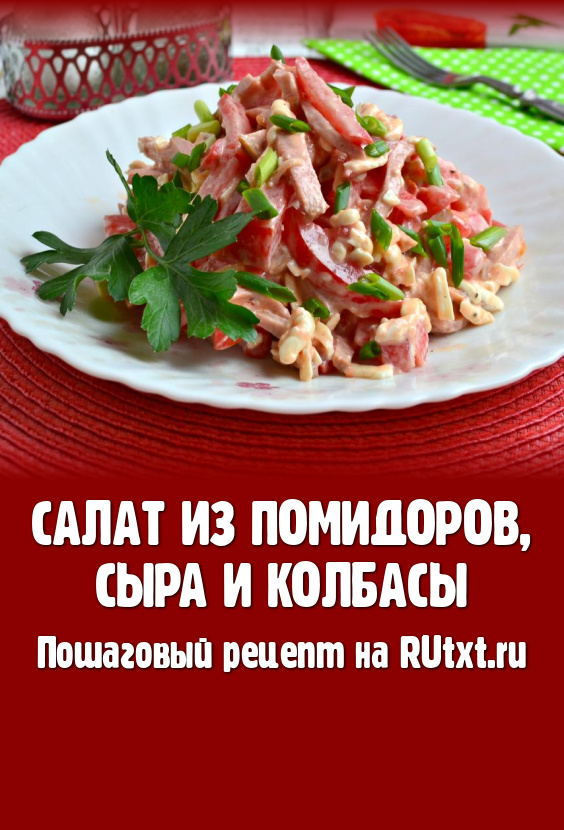 Простой и очень вкусный салат, приготовленный из помидоров, сыра и колбасы, сразу же подать к столу, посыпав сверху измельченным зеленым луком.