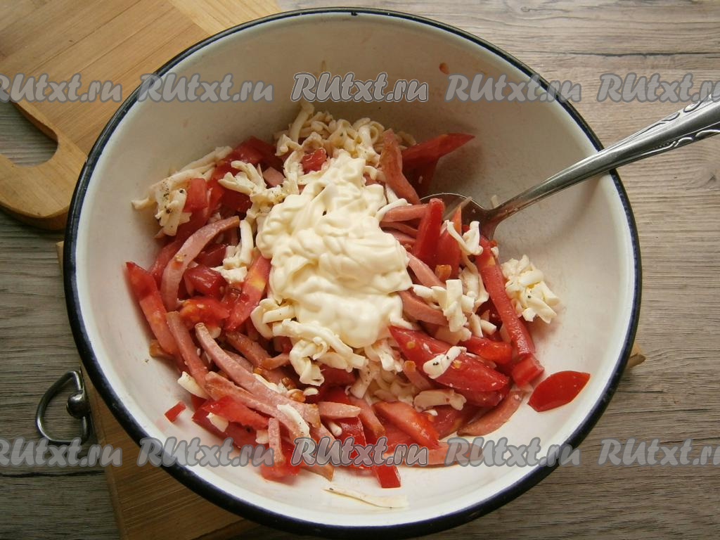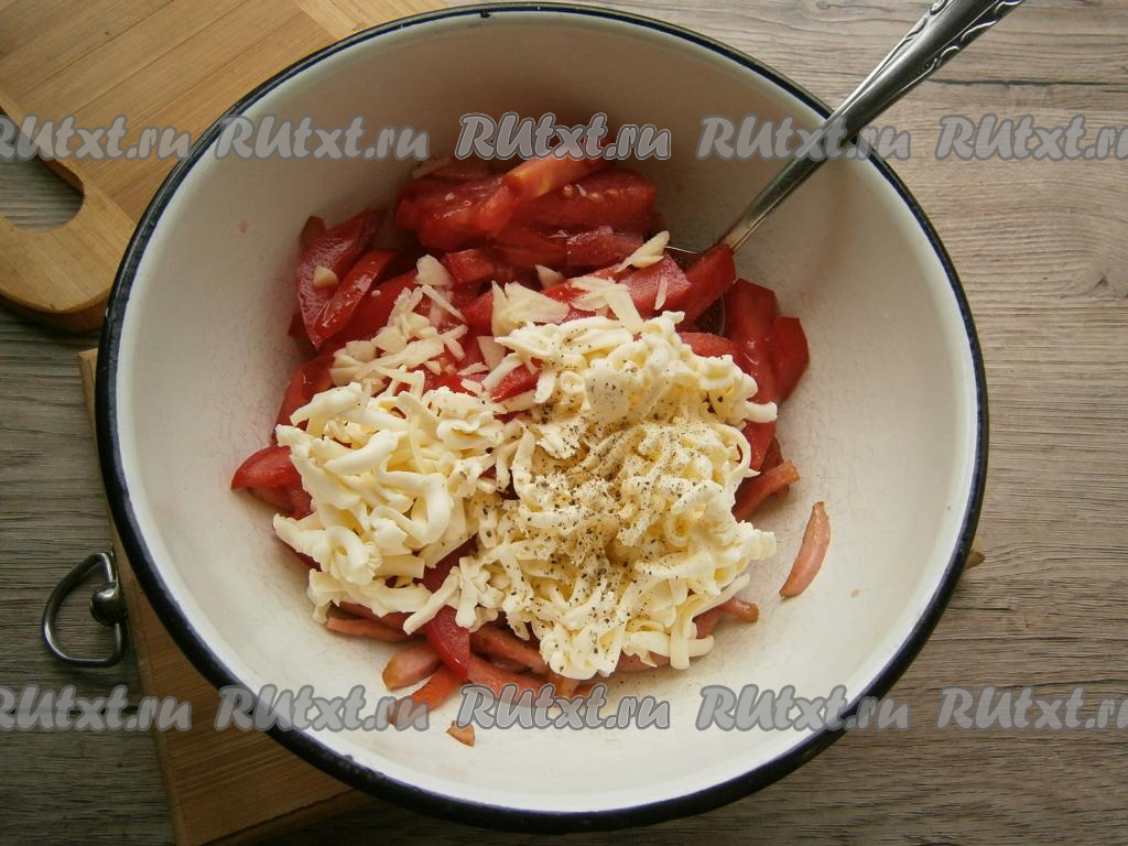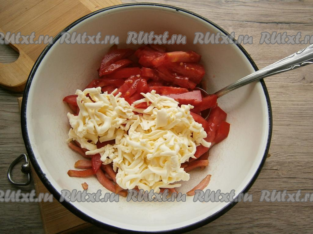 Добавить к колбасе нарезанные дольками свежие помидоры и натертый на крупной терке плавленный сыр.